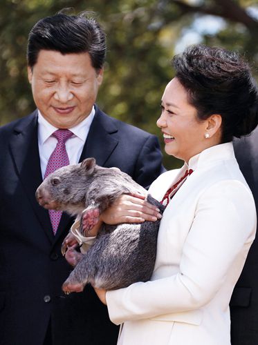 2014年11月17日,彭丽媛随习近平出访澳大利亚,在堪培拉总督府院内抱着一只袋熊。