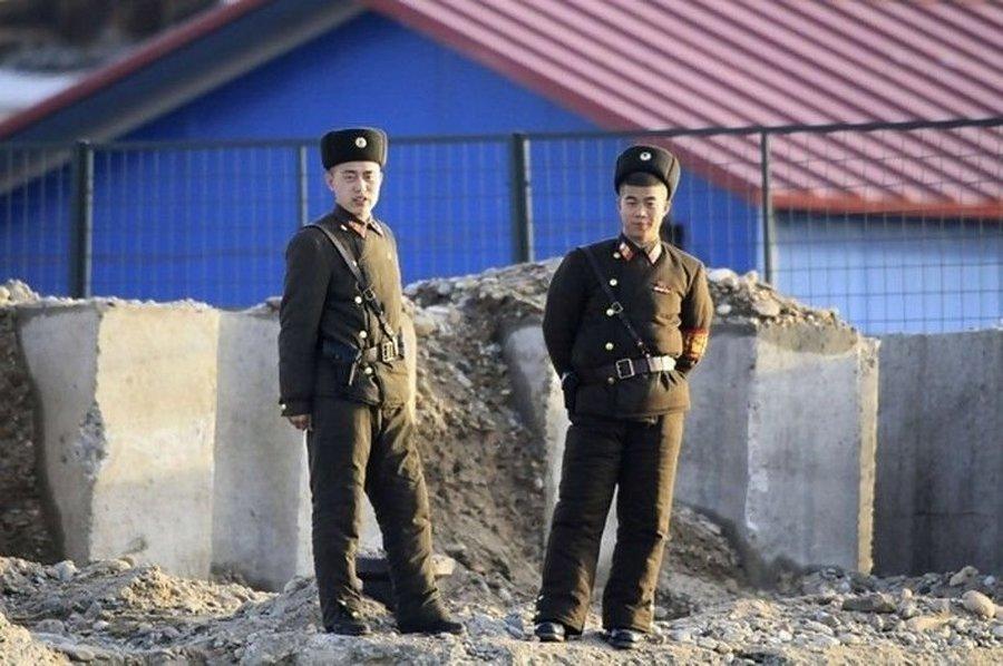 两名朝鲜人民军士兵面向中国方向。