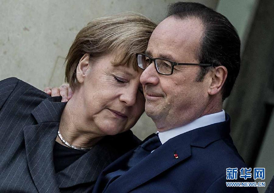 1月11日,在巴黎爱丽舍宫,法国总统奥朗德(右)迎接参加游行的德国总理默克尔。当日,法国政府在巴黎城区举行反恐大游行,法国总统奥朗德以及多位外国领导人参加游行,向近日倒在恐怖分子枪下的逝者致敬。新华社记者陈晓伟摄