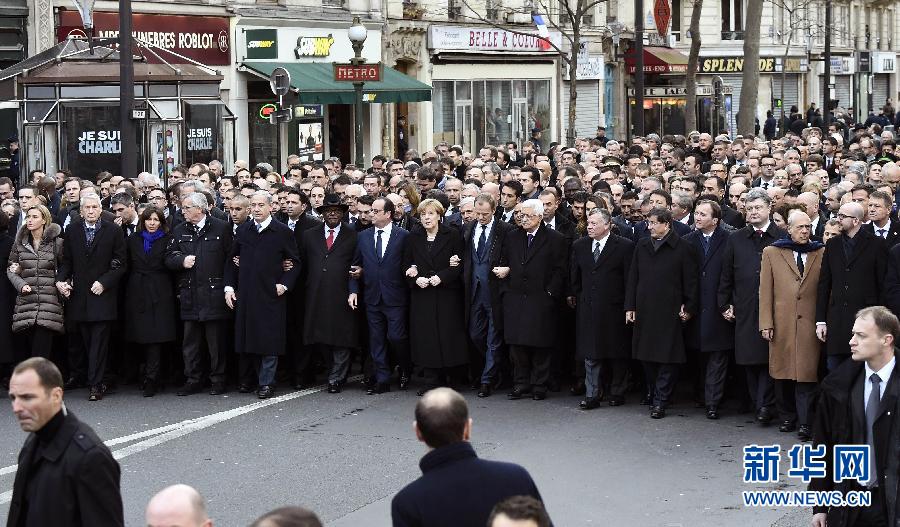 1月11日,在法国巴黎,法国政府官员和外国领导人与群众共同参加反恐大游行。当日,法国政府在巴黎城区举行反恐大游行,法国总统奥朗德以及多位外国领导人参加游行,向近日倒在恐怖分子枪下的逝者致敬。 新华社/法新