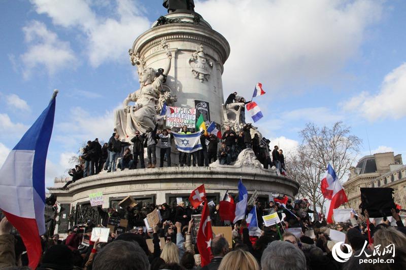 人民网巴黎1月11日电 (记者李永群)1月11日下午,法国300万人走上街头,举行反恐大游行。巴黎的反恐大游行由于50余个国家领导人参加而受到世界瞩目,游行从共和国广场出发,走向民族广场 。一路上记者在现场听到人们高唱《马赛曲》,高呼“我们不怕,我们是查理”等口号,反对恐怖主义。走在队伍前列的是巴黎恐怖袭击案受害者家属,随后是法国总统奥朗德、德国总理默科尔、英国首相卡梅伦等各国政要,他们手臂相挽,与巴黎150万群众一起表达对恐怖主义行径的抗议,表示团结一致共同反对恐怖主义的决心。摄影:李永群