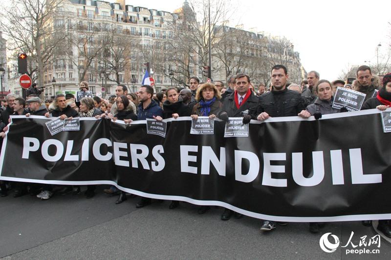 人民网巴黎1月11日电 (记者李永群)1月11日下午,法国300万人走上街头,举行反恐大游行。巴黎的反恐大游行由于50余个国家领导人参加而受到世界瞩目,游行从共和国广场出发,走向民族广场 。一路上记者在现场听到人们高唱《马赛曲》,高呼“我们不怕,我们是查理”等口号,反对恐怖主义。走在队伍前列的是巴黎恐怖袭击案受害者家属,随后是法国总统奥朗德、德国总理默科尔、英国首相卡梅伦等各国政要,他们手臂相挽,与巴黎150万群众一起表达对恐怖主义行径的抗议,表示团结一致共同反对恐怖主义的决心。摄影:李永群
