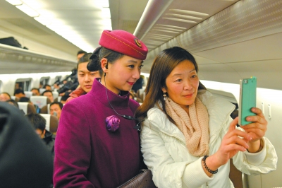列车行驶中,一位女乘客邀请列车长合影留念。京华时报记者王海欣摄