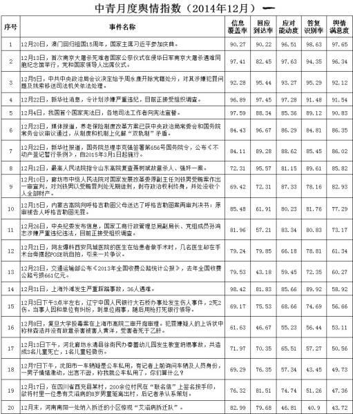 今天,中国青年报社中青舆情监测室发布2014年12月“中青月度舆情指数”(总第18期)。