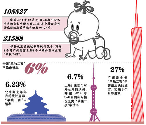 1月14日,广东省卫生计生委通报,截至2014年12月31日,共有105527对单独夫妇申请生育二孩,当中96197对符合条件而获准。