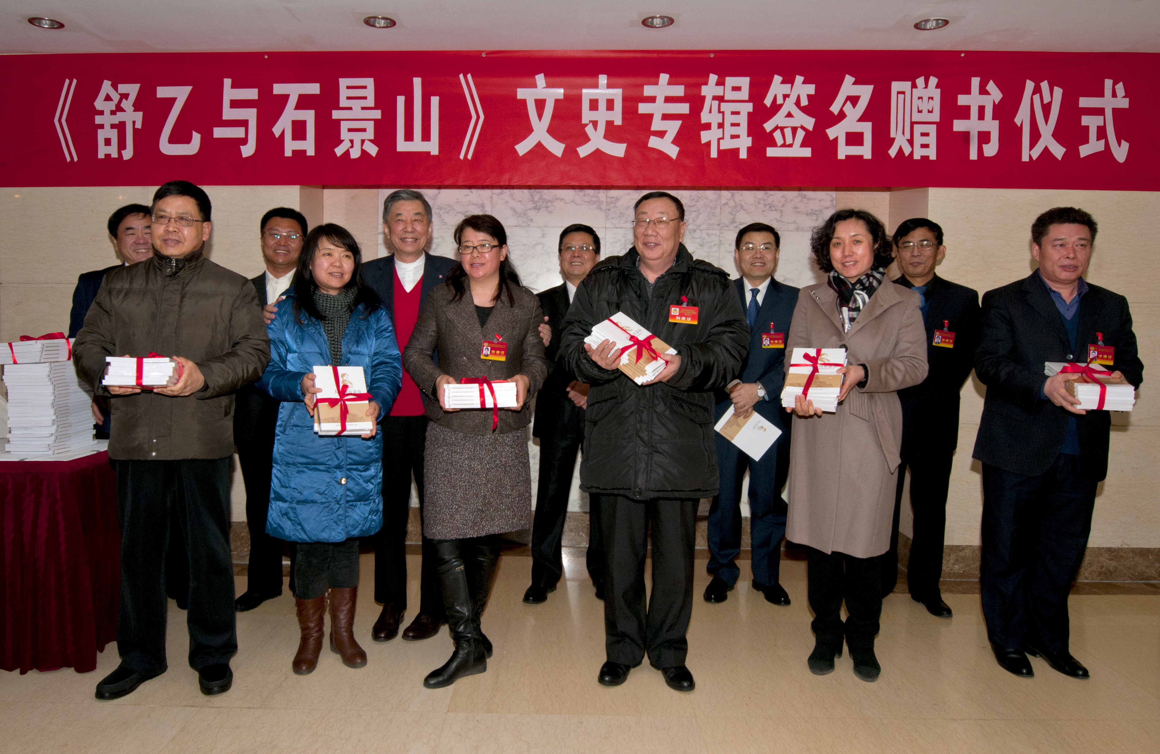 1月12日,政协北京市石景山区政协九届四次会议开幕式后,由政协北京市石景山区政协文史委编辑的《舒乙与石景山》文史专辑签名赠书仪式在京燕饭店举行。北京市石景山区委书记牛青山,区委副书记、区长夏林茂,区人大常委会主任赵玉民,区政协主席岳德顺,区委副书记、政协党组书记吴克瑞等区领导与舒乙先生亲切交谈,接受赠书。