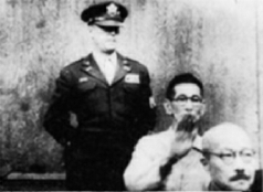 1946年5月3日,远东国际军事法庭开庭,大川周明上庭受审??デ埃谋缁ぢ墒υ肭蠖运鼍窦?,但被驳回??ズ?,大川做出种种怪异举动:他先拿起前排东条英机的笔记本看了半天,继而袒胸露腹,鼻涕流成“亮晶晶的细线”也不擦。下午3点37分,大川周明突然伸出又细又长的手在前排东条的秃头上重重打了一下。此举让东条吃了一惊,继而苦笑,也让在场诸人随之笑了起来。