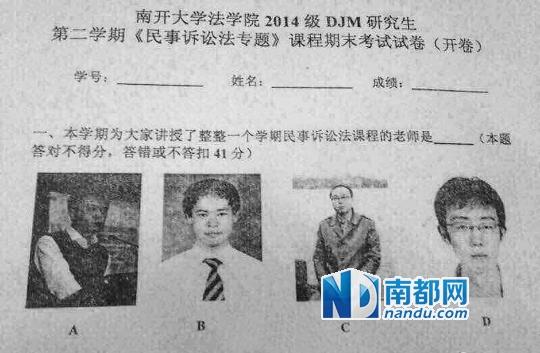 昨日,一道南开大学法学院的“神考题”爆红网络。这道题目需要辨认上课老师的照片,答对不得分,答错或不答不及格。