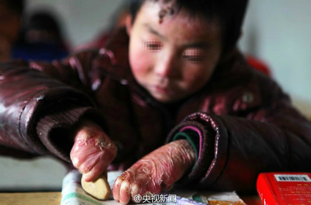 宋刘臣,8岁,患先天大疱性表皮松解症,皮肤一碰就烂,母亲为他裹卫生纸保护皮肤,吸收血水。乡里给他申请了帮扶金,但这种病难以治疗。宋刘臣仍坚持上学,用残缺的小手写字,他说要考大学。