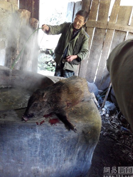 1月5日下午5点左右,几人看见一头黑熊,白某举枪便打,黑熊中弹之后掉下山坡。找到时,黑熊已经死亡。但黑熊有100多斤,几个人觉得运送起来不方便,就将黑熊用一根绳子吊在一棵树上后几个人回家。第二天一早,几个人带上器具,来到山上将黑熊剥皮、分肉,带下山来。图为偷猎者加工被猎杀的野猪。