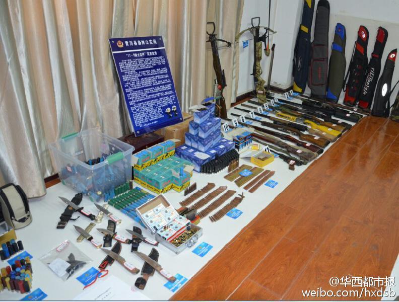 在李某某老家有一个小型“军火库。民警当场查获各类枪支6支,其中仿美国秃鹰预充高压气枪一支、五连发猎枪一支、双管猎枪一支、小口径步枪一支、单管猎枪两支;非法持有弹药共2830发,其中“雄鹰”牌12号猎枪弹1266发、“51式”7.92毫米步枪子弹59发、“56式”7.62毫米步枪普通弹135发、“64式”7.62毫米手枪普通弹70发、“双环”牌小口径步枪弹1300发;废弹壳188发,子弹改装设备一套,管制刀具7把。图为广元青川查获的偷猎团伙的作案工具及非法猎获的野生动物制品。