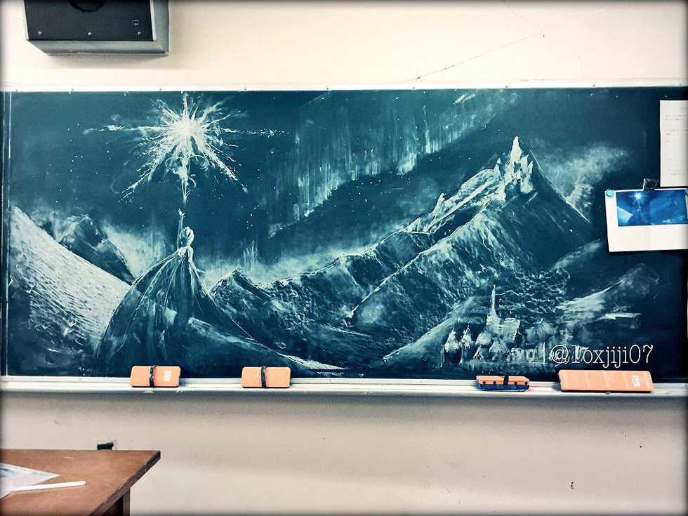 原标题:日本高中生高考后用粉笔在黑板上绘制《冰雪奇缘》(高清组图)