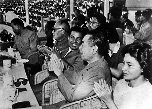 1965年9月,周恩来、陈毅陪同西哈努克在大田湾体育场观看足球比赛。