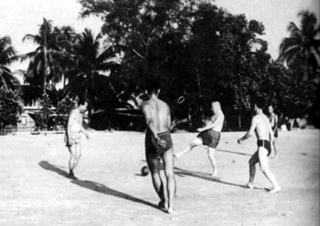 1966年4月,陈毅访问缅甸时,在额不里海滩同缅甸总统吴奈温(左)踢球。
