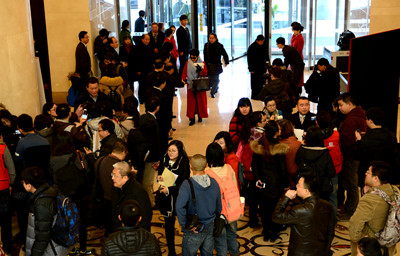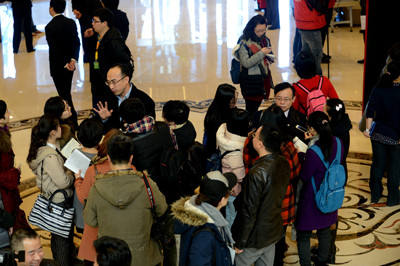 北京市政协十二届三次会议下午三时开幕。图为1月21日上午,北京五洲大酒店委员驻地,前来报道的委员就热点话题接受媒体记者采访。