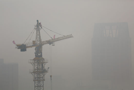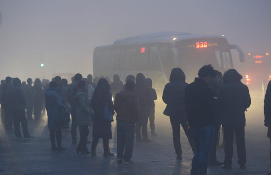2014年12月10日清晨,京津冀地区遭遇雾霾袭扰,在河北廊坊燕郊酒厂公交车站,一群北京上班族在等待公交车