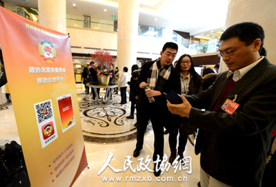 进入北京市政协十二届三次会议驻地大堂,新媒体APP移动平台“政协北京市委员会移动议政平台”的指示牌尤为引人注目。根据提示,委员们只要手机扫描牌示上的二维码,就可以下载这一程序,并可随时随地通过手机APP查看政协动态、资料和活动通知等。