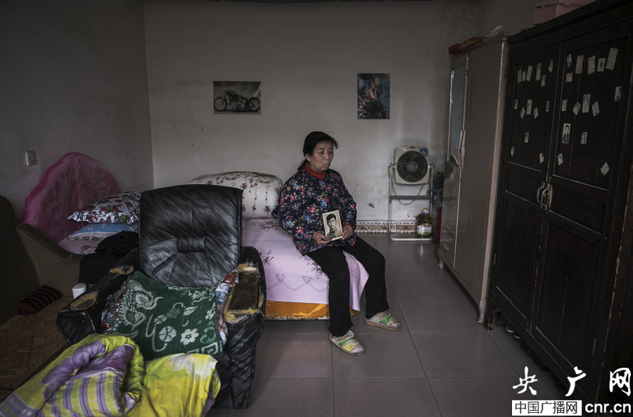 刘媛玲抱着丈夫的遗像坐在房间里,刘媛玲,67岁,株洲市石峰区桎木组村民。丈夫刘传斌,1995年因肺癌去世,时年51岁。