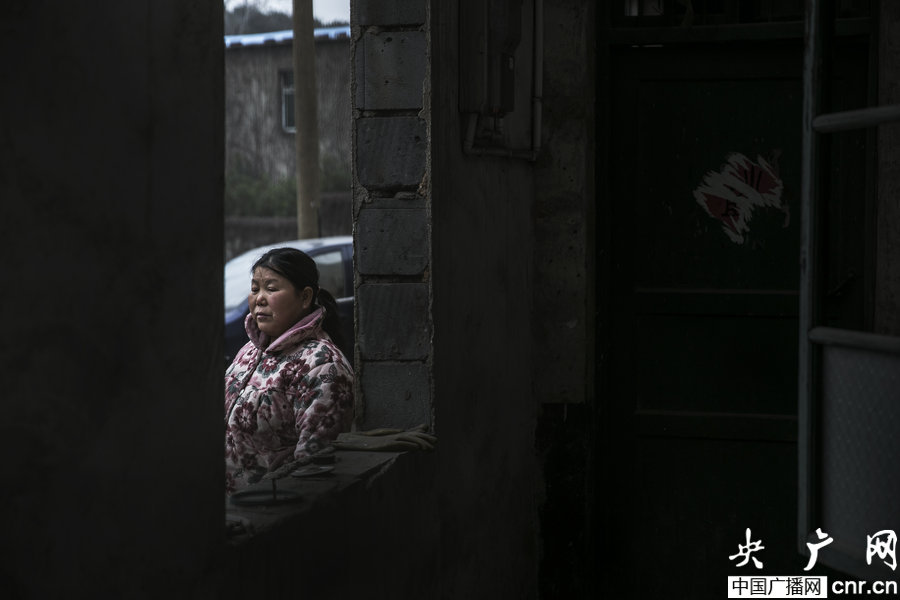 村民刘玉连在自家房屋外,刘玉连,49岁,株洲市石峰区桎木组村民。丈夫宋凤斌1990年因肝癌去世,时年32岁。
