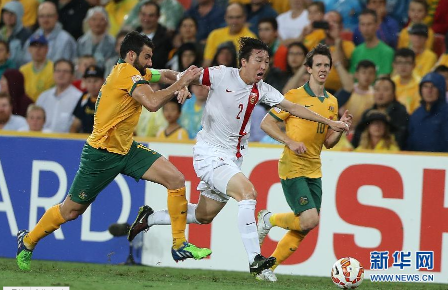 1月22日,中国队球员任航(中)在比赛中拼抢。当日,在澳大利亚布里斯班体育场进行的2015年亚洲杯足球赛四分之一比赛中,中国队对阵澳大利亚队。 新华社记者曹灿摄