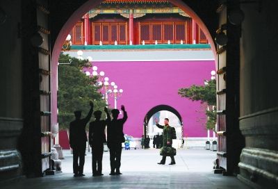 高红甫背起打好的背包,拎上行李,告别自己驻扎了12年的营地。几位战友坚持要送出来,他们在故宫端门口依依不舍挥手告别。