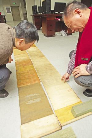 22日上午,记者来到位于景江西路和群力第五大道交口的市文管站,只见两件长约2.7米、宽33厘米的诏书已经铺在地上。诏书虽已泛黄,但上面字迹仍一清二楚,其文字采用满汉双语书写,满文行款从左至右,汉字行款从右至左,盖在字上的红色大印有些模糊。诏书为绢织制作,两端分别织有两条盘龙。翻过背面看,两件诏书一呈金黄,一呈彩色。
