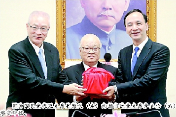 图为国民党代理主席吴敦义(左)向新当选党主席朱立伦(右)移交印信。