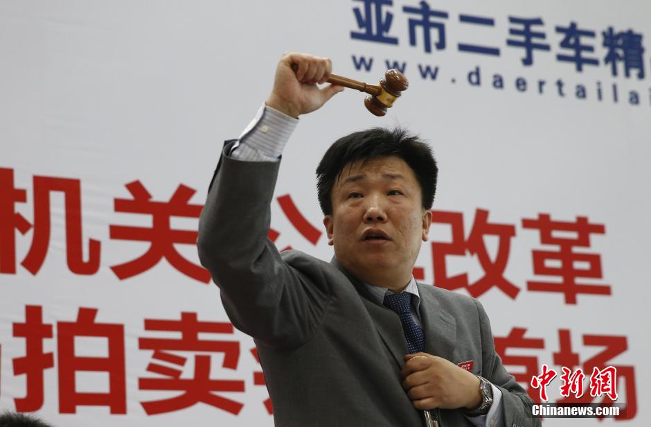 1月25日,中央和国家机关公车改革取消车辆首场拍卖会在北京中拓国际拍卖有限公司举行。据悉,首批中央和国家机关公车改革取消车辆拍卖共涉及300余辆公车,分三次进行拍卖。1月25日在北京中拓国际拍卖有限公司举行首场拍卖后,北京北汽鹏龙机动车拍卖有限公司和北京花乡拍卖有限公司的拍卖将分别在1月26日和2月1日进行。图为拍卖师举锤。中新社发 张浩 摄