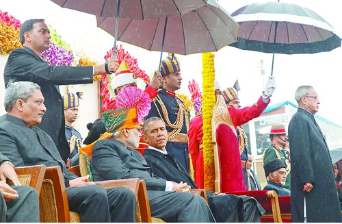 26日一早,薄雾伴着细雨,第66次印度共和国日检阅在新德里国王大道举行。上午10时,奥巴马的“野兽”专车在一长串护卫车的簇拥下缓缓驶来。随后,奥巴马夫妇被请上由防弹玻璃防护的主检阅台。这个特设的主检阅台只有不到10个座位,除了奥巴马夫妇和莫迪,只供印度总统、副总统及夫人就座。
