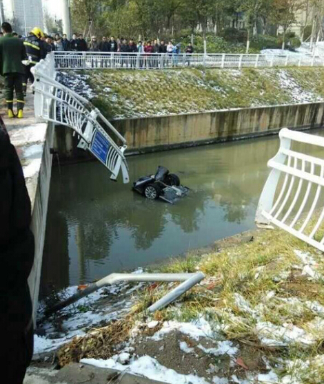 2015 年1月30日,武汉汉阳区一广本4S店试驾车在试驾过程中坠入陶家岭路一侧的水渠内,车内四人被困,半小时后被救援人员救出,但被困者或因溺水时间过长全部身亡。据现场目击者称,当时该车正准备超车,车速很快,可能因操作不当在与一辆红色小车发生碰撞后失控倒扣着坠入水渠,几位现场群众报警并拿来梯子下到水渠中准备救援,但未能成功,直至消防人员赶到后经过半小时的施救才将被困人员救出,但车内四人已遭遇不幸。图为事发现场。