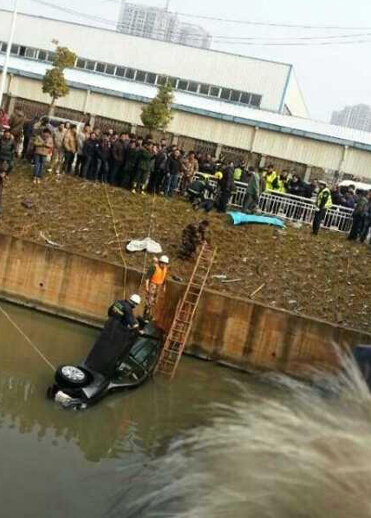 事发后,虽然有市民试图下水救援,无奈轿车距岸边较远,水较深。半小时后,消防人员赶到现场,用绳索将车拖到水渠边,搭梯爬上车,打开副驾车门,从车内拉出三男一女。车上4人,2人当场死亡,另一男一女被送往同济医院,后经抢救无效死亡。图为事发现场。