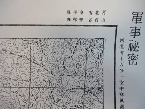 这张标注着“军事秘密”警告字样的“河南省十万分一五十六号”洧川县和阜平县地图,由多川部队测量班在昭和十三年(即公元1937年)根据空中航拍和实地测量所绘制,图中非常详细标志了阜平县的地形、山川、河流和村镇位置,以及洧川县的全部村庄、城镇、道路和边界,指示出往北京、汉口、许昌等城市的方向,精确度很高,为日军的军事行动提供了详尽的情报指引。
