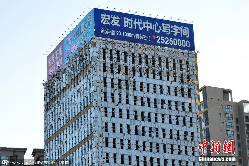 2015年1月30日,辽宁省沈阳市,沈阳大楼四周整体外墙现保新塑料膜写字楼市民称塑料袋大楼墙贴凌乱不堪在近处观看令人视觉错乱眼花。小沈阳 摄