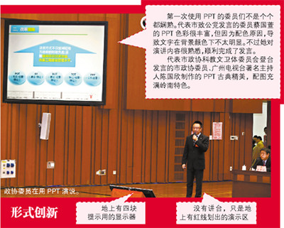“撤掉发言台、要求脱稿、播放PPT,这是广州的创新,在全国估计也是第一个。”谈及今年的改变,广州市政协副秘书长范松青颇为自豪。往年的大会发言,委员们站在发言台后面,可以照着稿子念,在范松青看来,这是“照本宣科”。“效果不好,台上的没激情、台下的打瞌睡,还有看手机的、早退的。”据悉,因为要制作PPT、并且脱稿,上台发言的委员们都不敢怠慢,很多人的PPT修改了五六次,政协也组织了三四次“彩排”,力求精益求精。范松青认为,今年的改革,已经达到了预期的效果。