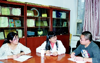 丁洁委员(图中)与研究生们讨论肾脏病的课题研究。