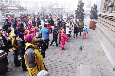 3日10时,记者来到建筑艺术广场时,没有看到以前群鸽环绕教堂翱翔的情景,地面上只有30余只鸽子走动,教堂穹顶周围也稀稀拉拉地蹲着一些。在教堂的一角,七八位小朋友手里攥着刚刚买来的鸽粮,等待鸽子飞到地面上吃食。整个广场上手里举着鸽粮的游客约有百人,鸽子却蹲在教堂上,迟迟不往地上落,而以前早就有鸽子来啄食了。“小鸽子冷了”“小鸽子吃饱了,想休息一会”等待喂食的小朋友们说。