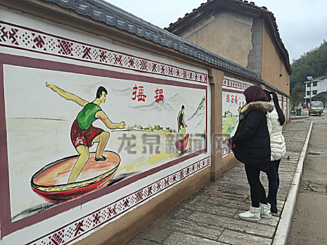 游客在欣赏畲乡彩绘。竹垟畲族乡在罗墩村、盖竹村等少数民族村落,通过改造、喷绘、“涂鸦”等形式,将反映畲民生产生活习俗的畲乡文化搬上墙,形成了一道畲乡风情浓郁的文化长廊。