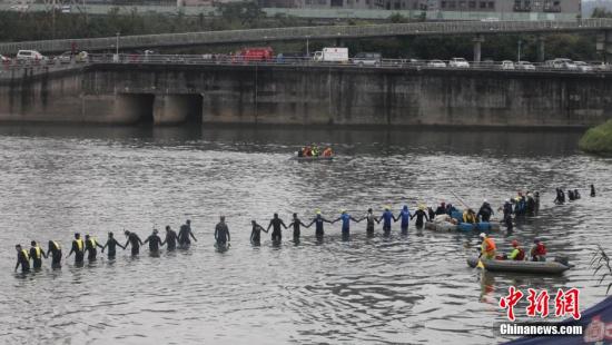 2月6日,复兴航空GE235班机坠河空难发生后第3天,搜救工作仍在继续。上午基隆河水位下降至齐腰深,搜救人员抓紧时机寻找失踪者,并连续寻获多具遗体。图为搜救潜水员组成人墙,对河床进行地毯式搜索。 中新社发 路梅 摄