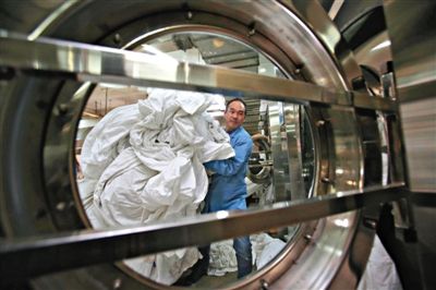 目前,清洗车间里10台全自动滚筒洗衣机已全部开动,每次洗涤用时约1小时。洗衣机上方都接有蒸汽管道,锅炉加热的蒸汽从管道进入清洗缸,清洗过程中缸内温度不断上升至80℃,实现高温消毒。