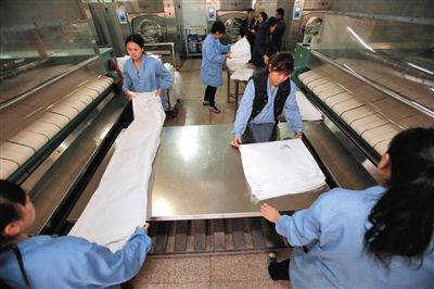 走进清洗车间,过道两边,一边是洗衣机,另一边是熨烫机。两米多宽的熨烫机,前后四人一起工作。前面两人拎出洗好的床单,各拉一角抻平,同时放到滚轴上,床单进入机器。