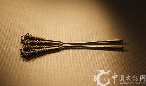 丫形双股金发钗,南宋时期文物,1988年在江西省德安县宝塔乡杨桥村“南宋咸淳十年周氏安人墓”中出土,现藏德安县博物馆。钗体呈“丫”形,双股,金质。其造型和树杈十分相似,是古代妇女的发饰。