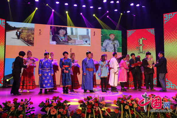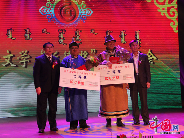 蒙古文学“沃德奖”颁奖晚会,嘉宾为获奖作者颁奖。