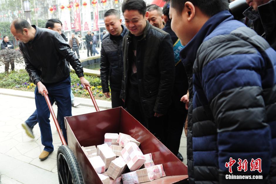 据了解,为加大农民工工资兑现力度,当阳市于近期组成10多个工作专班督办企业欠薪问题,维护农民工权益。图为用小推车发3197万元现金。王康明 摄
