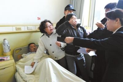 昨天下午2点10分,执行法官与法警们一同来到京煤医院住院楼,陈某躺在骨科病房34床上,5名家属在其身边或坐或站??吹椒ü俳?,家属们情绪激动,与法官们撕扯起来。
