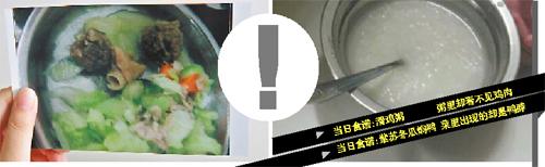 有家长将照片打印了出来,“看了我就揪心。”指着一沓照片,家长说,孩子的早餐由今年5月以前的两个点心一个汤改成了一个点心一个汤,原来供应的鸡蛋或鹌鹑蛋不见了;粥里不但没有瘦肉,还稀得可以当镜子照;吃的鸭肉不见了,取而代之的竟然是鸭脖……
