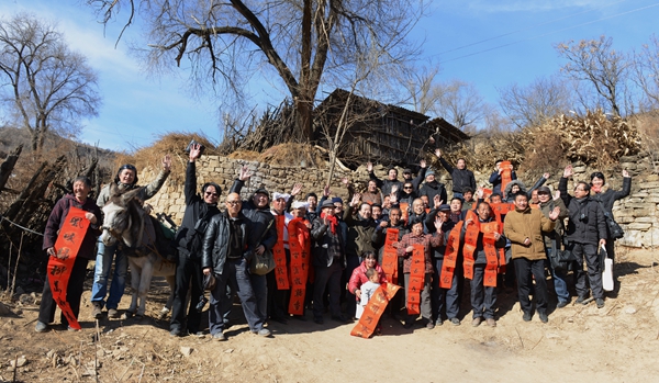 2月4日下午,画院艺术家一行又来到甘泉县石门乡晋塔村,为当地村民送去新春对联。当艺术家们把一幅幅充满情谊的春联送到村民手上,黄土搭建的小院子里立刻充满了年味。尼玛泽仁说:“国家画院在开年之前用行动来落实习总书记的讲话,到生活中来,到人民中去,把文化送人民,用文化惠人民。写几个字微不足道,但看到我们的文化确确实实给人民带来了快乐,这就是我们的责任”。红彤彤的春联在金黄色的窑洞里流动,笔墨在画家们的手中传情。村委会村支书袁治东告诉记者:“村庄的人口稀少,平日里村里十分宁静,画家们的到来,为村庄增添了生机,我们很激动,也很开心,感谢他们来到这里,让这里有了年味,希望他们以后常来!”