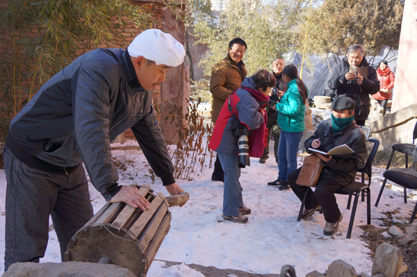 陕北独特的地理风貌曾经孕育出了长安画派和黄土画派,在当代美术史上留下了灿烂的一笔。2月4日的晋塔村,皑皑白雪给厚重的山脉增加了层次和情趣,头扎白羊肚手巾的腰鼓队在村口用最原始热烈的方式迎接各位客人,在陕北人民的传统居所,古朴的窑洞依山而建,院落中晒太阳的猪、牛、羊和散步的鸡群、推磨的驴子,构成了一幅幅充满着生活气息的画卷?;颐欠追拙倨鹣嗷?、拿起速写本。李庚、于志学等看到淳朴的陕北腰鼓汉子就立刻画起了速写;杨晓阳院长坐在磨旁边一口气画了3幅,笑称把所有在场的人都画进去了;乔宜男是花鸟画家,但看到这样的地貌也忍不住勾勒起了山水全景;尼玛泽仁冒着寒风坐在石阶上手握画笔不停地写生。村民们围在画家周围观摩,孩子们则聚在画家的身边看着跃然纸上的家园兴奋不已,这应该是最好的艺术启蒙吧。正在写生的王平说:“这次来延安体会到一些长安画派作品里的意境,艺术来源于生活,身临其境更能理解一些笔墨的来源,像刘文西先生的作品中淳朴的风土人情,都是接地气的。到不了这样的地方,出不了这些作品。虽然生活上比较贫困,但能感受到他们追求美好、向往美好的精神,即使在生活的磨难重压下仍然能够倾诉出来。在这里,能感受到真实的生活层面。”