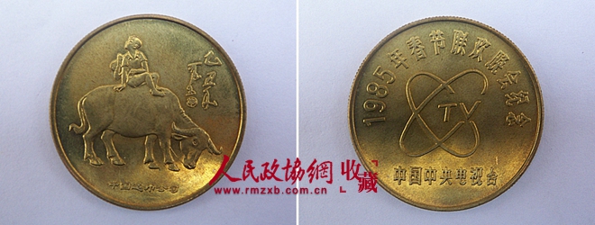 1985年春节联欢晚会赞助纪念券,面额为“壹圆”,券面左侧有春灯图案,下方印着“中央电视台、中国工商银行联合主办”。奖项设置10万个为一组,一等奖14寸熊猫彩电一台,二等奖金质币10枚,三等奖银质币100枚,四等奖铜质币1000枚,纪念奖为铝质币。在当年2月19日春节联欢晚会上进行现场公证摇奖,没能中奖的观众,可凭纪念券到当地工商银行领取铝质纪念币一枚。作为奖品的金、银、铜质币以及铝质纪念币,虽然材质、规格各不相同,但正、背面图案大同小异。正面中间是中央电视台的台标“CCTV”,上边呈环状铭有“1985年春节联欢晚会纪念”,台徽的下面标有“中国中央电视台”。背面图案分别采用的是现代著名画家李可染绘制的国画作品《孺子牛图》、《归牧图》。笔者所中四等奖的铜质纪念币直径为3.2厘米,厚度0.2厘米,背面是一幅《归牧图》,画面为儿童背着一顶草帽坐在牛背上,右边题着“乙丑年”三个字和画家的落款,下面标注“中国造币公司”。铝质纪念币直径为2.6厘米,厚度为0.2厘米,类似已停止流通的早期五分硬币。