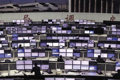 昨日,北京铁路局调度指挥中心,当班调度员监控、指挥春运列车。这里是亚洲最大的调度指挥枢纽,有245个调度工位,管辖京沪高铁、京广高铁等17条主要干线。新京报记者 周岗峰 摄