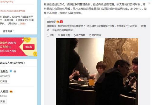 郭敬明留言称,“转发已经超过500。按照互联网管理条例,已经构成虚假污蔑。昨天是我们公司年会,照片是我们公司全体用餐,照片上旁边的男生是我们公司的设计总监胡先生。24小时内,如果你不删除,我就进入司法程序”。